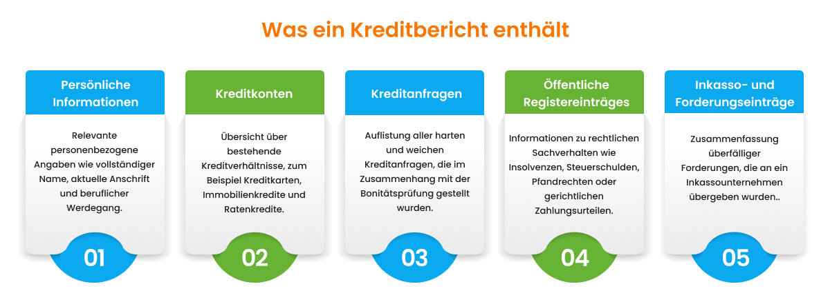 Ein Kreditbericht besteht aus mehreren klar strukturierten Bestandteilen, die zusammen ein umfassendes Bild der finanziellen Situation liefern.