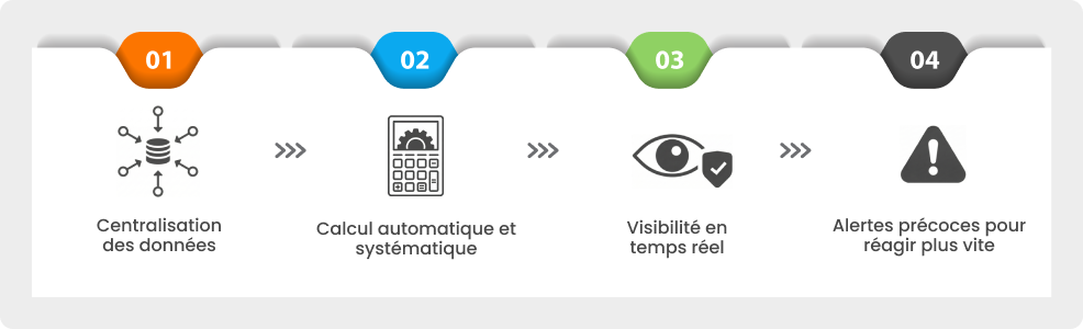 Aux calculs manuels, longs et répétitifs, l’automatisation oppose un traitement systématique. Les écarts sont générés en continu à partir des données réelles, sans retraitements fastidieux. Le temps ainsi libéré peut être consacré à l’analyse et au pilotage.