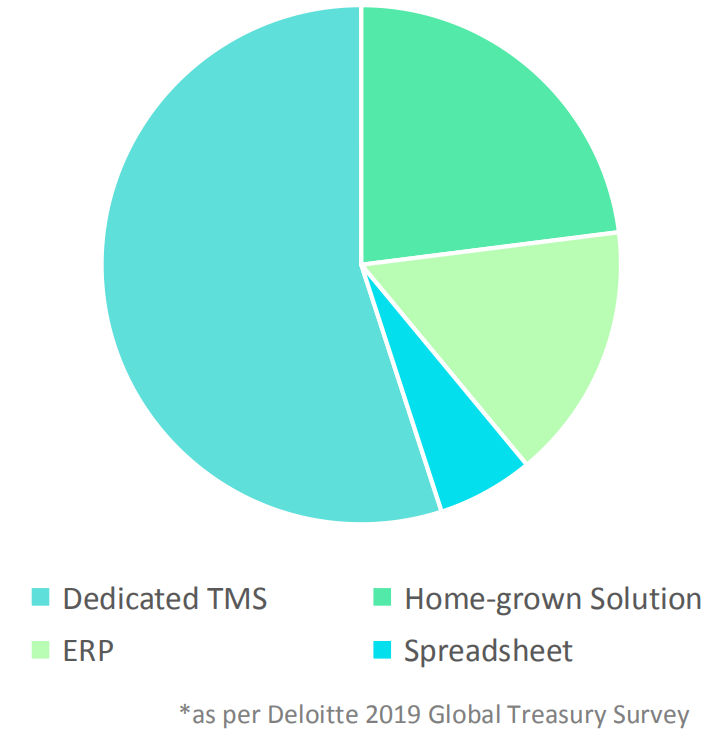 In the past decade, the use of spreadsheets has steadily declined to owe to the use of systems like TMS or ERP in Treasury functions. With an adoption percentage around 55% for TMS and 23% for ERPs, they have still not evolved entirely to meet the demands of treasurers. The low rate of adoption of these systems, especially in SMEs can be linked to a high cost of ownership, adoption and maintenance complexity, and a smaller demographic for business operations. Another reason may be their ability to run only simple functions, where they fail to accomplish complex tasks due to lack of specialization or updates from vendors, such as accurate cash forecasting or robust risk management.