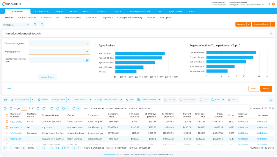 Collections analysts are assigned customers based on region and customer segment (for example, NA vs EMEA or Large Accounts vs SMB). Accounts Receivable or Collections Managers oversee portfolio performance and monitor past-due coverage as part of end-to-end collections management.